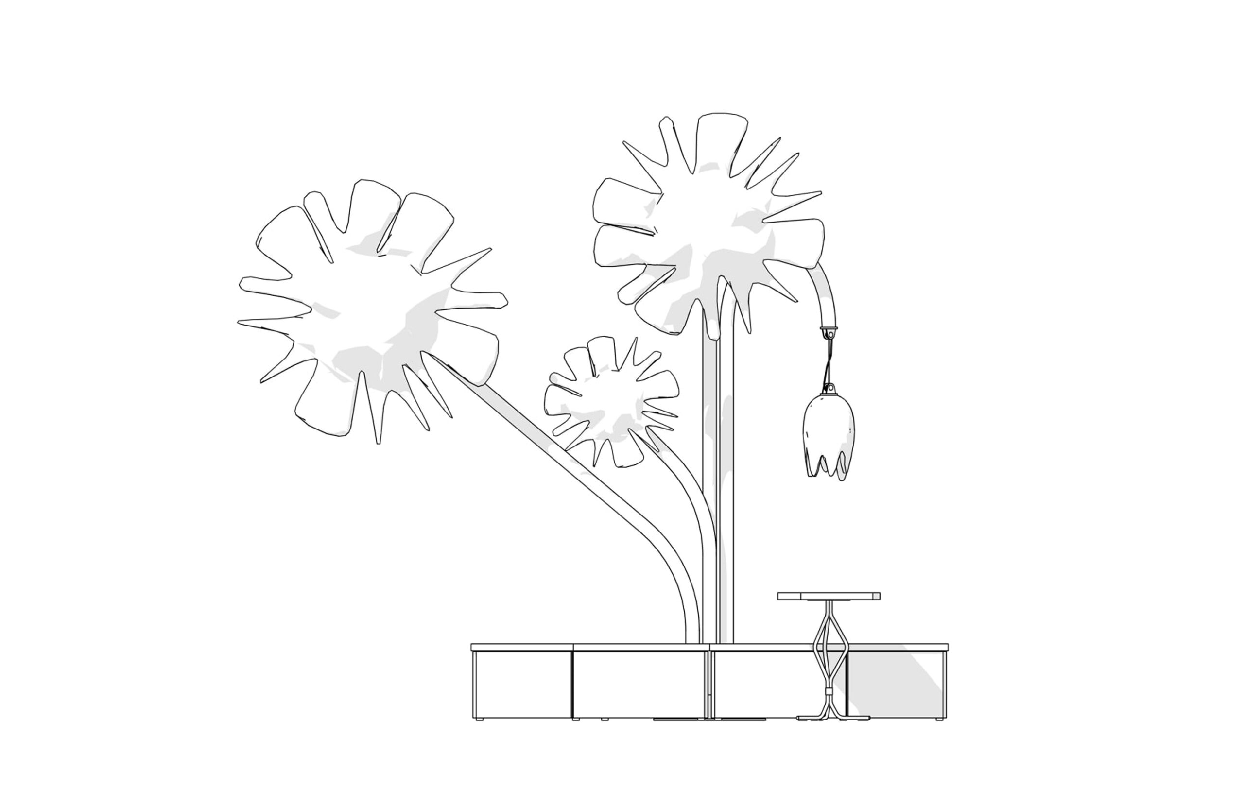 Hydroforming, developed in the mid-20th century for the automotive and aviation industries, is rarely used in interior design. The essence of the method lies in sealing two metal sheets along the perimeter and inflating them with water under high pressure, forming complex volumetric shapes with smooth transitions. In this project, the technology was applied to create the most “alive” kind of plasticity — one that echoes the natural form of flowers.