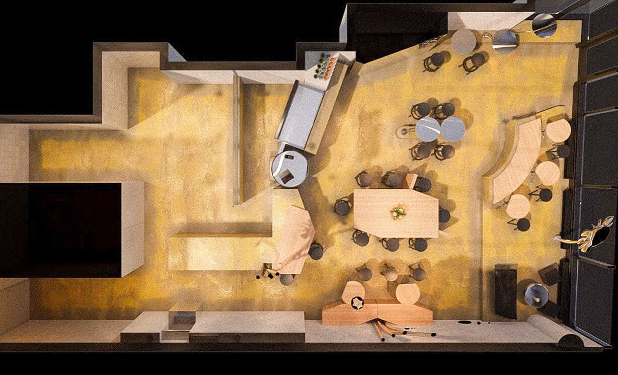 At the center stands a table crafted from reclaimed wood — a quiet echo of what once was, grounding the energy that surrounds it. The idea of HEYDAY guided every decision: sunlight, motion, renewal. Inspired by the sunflower — our symbol of vitality and growth — we brought its essence into the space: a yellow floor radiating warmth, and polished steel forms above, catching the shifting light like petals reaching for the sun.